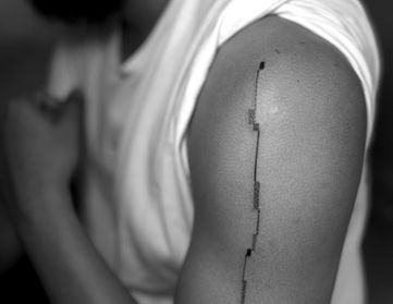 Tattooing as an art form evolved with tools and contexts. Working on bodies from all around the world, the artist realises narratives and aesthetics onto the skin. The use of the hand-poking technique as a medium came about with the idea of providing the receivers with an experience of fully indulging in the process, where dots make the shape.